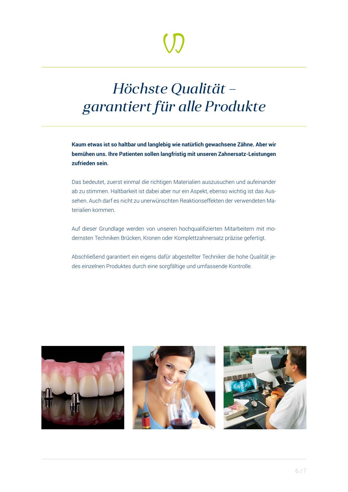 6 7 Kaum etwas ist so haltbar und langlebig wie natürlich gewachsene Zähne Aber wir bemühen uns Ihre Patienten sollen langfristig mit unseren Zahnersatz Leistungen zufrieden sein Das bedeutet zuerst einmal die richtigen Materialien auszusuchen und aufeinander ab zu stimmen Haltbarkeit ist dabei aber nur ein Aspekt ebenso wichtig ist das Aus sehen Auch darf es nicht zu unerwünschten Reaktionseffekten der verwendeten Ma terialien kommen Auf dieser Grundlage werden von unseren hochqualifizierten Mitarbeitern mit mo dernsten Techniken Brücken Kronen oder Komplettzahnersatz präzise gefertigt Abschließend garantiert ein eigens dafür abgestellter Techniker die hohe Qualität je des einzelnen Produktes durch eine sorgfältige und umfassende Kontrolle Höchste Qualität garantiert für alle Produkte